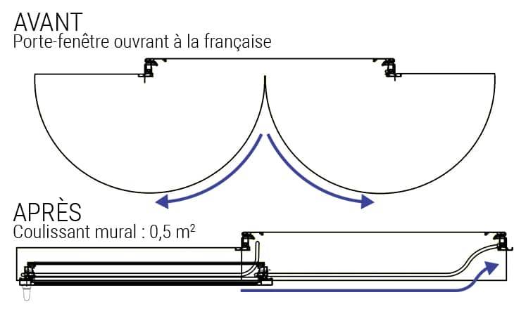 Ouverture totale avec très peu d'encombrement au sol (divisant par 3 l'emprise au sol), pratique et ingénieux, le coulissant mural vous apportera modernité, confort et sécurité. Très performant en termes d'isolation, c'est l'option idéal pour faire des économies d'énergie et inonder une pièce de lumière.