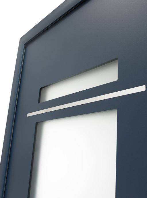 Ouvrant de 80 mm d'épaisseur, la porte d'entrée en aluminium, présentée ci-contre, est séparée de 5 vitrages rectangulaires sablés, de tailles différentes, par des décors inox (lames miroir) affleurants à l'aluminium.
