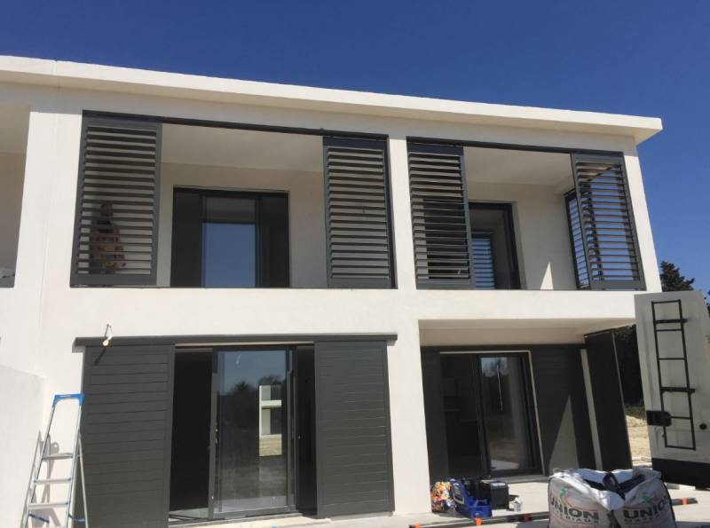 volets coulissants à lames orientables, et d'un